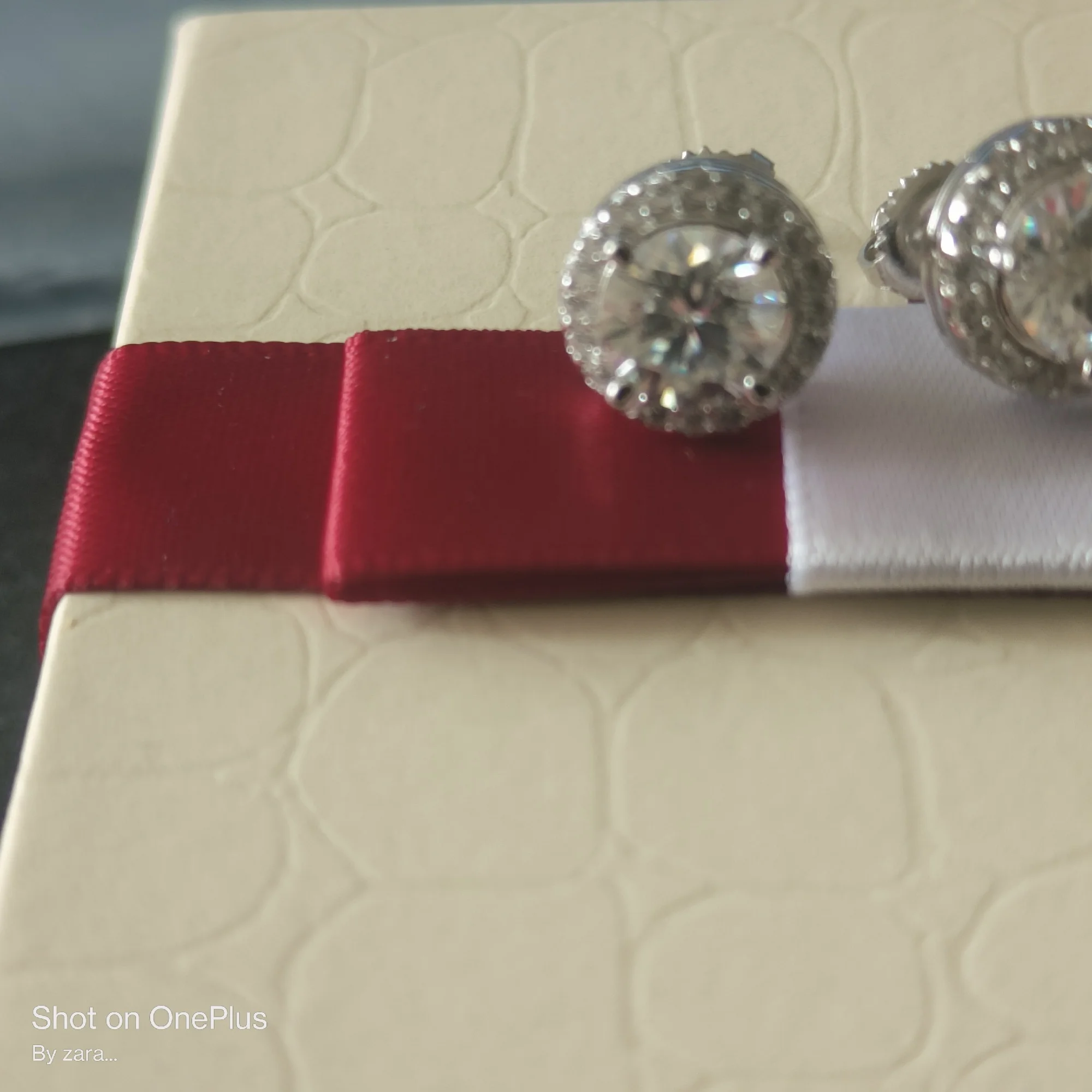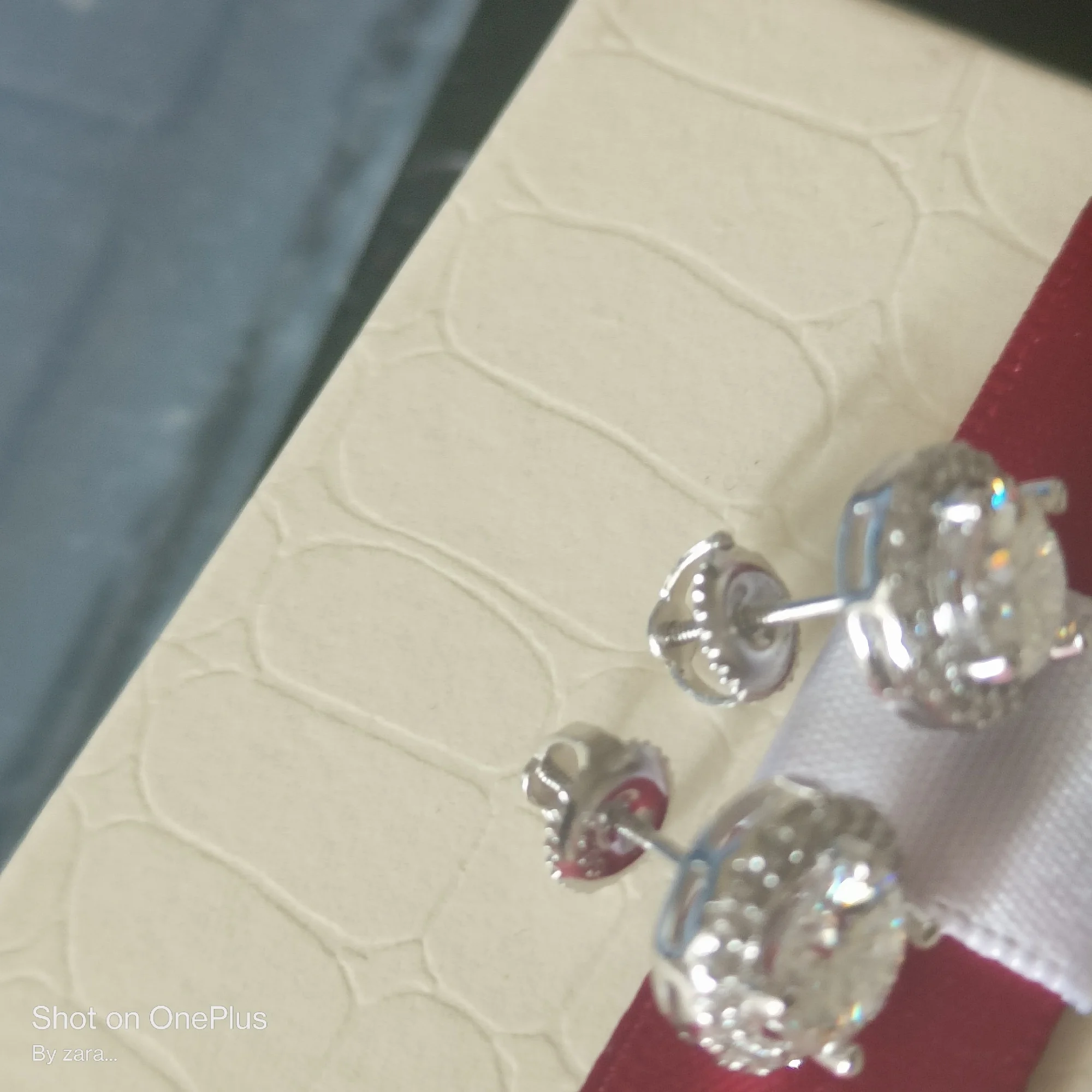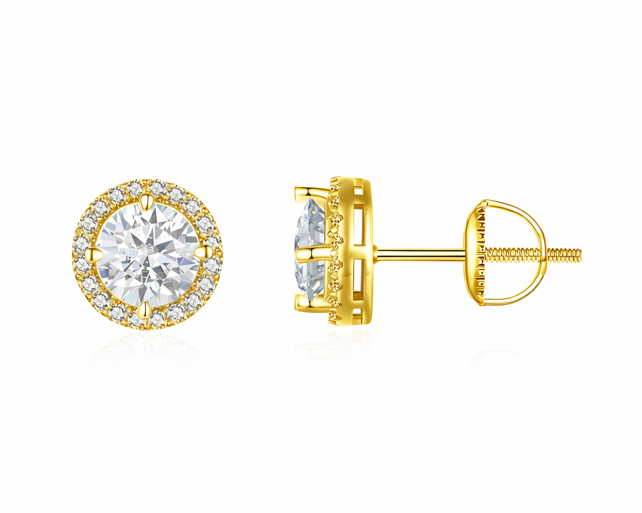 The Azoria Earrings embody classic sophistication with a modern touch. Featuring a radiant round-cut center Moissanite surrounded by a delicate halo of shimmering stones, these earrings are designed to capture light from every angle.