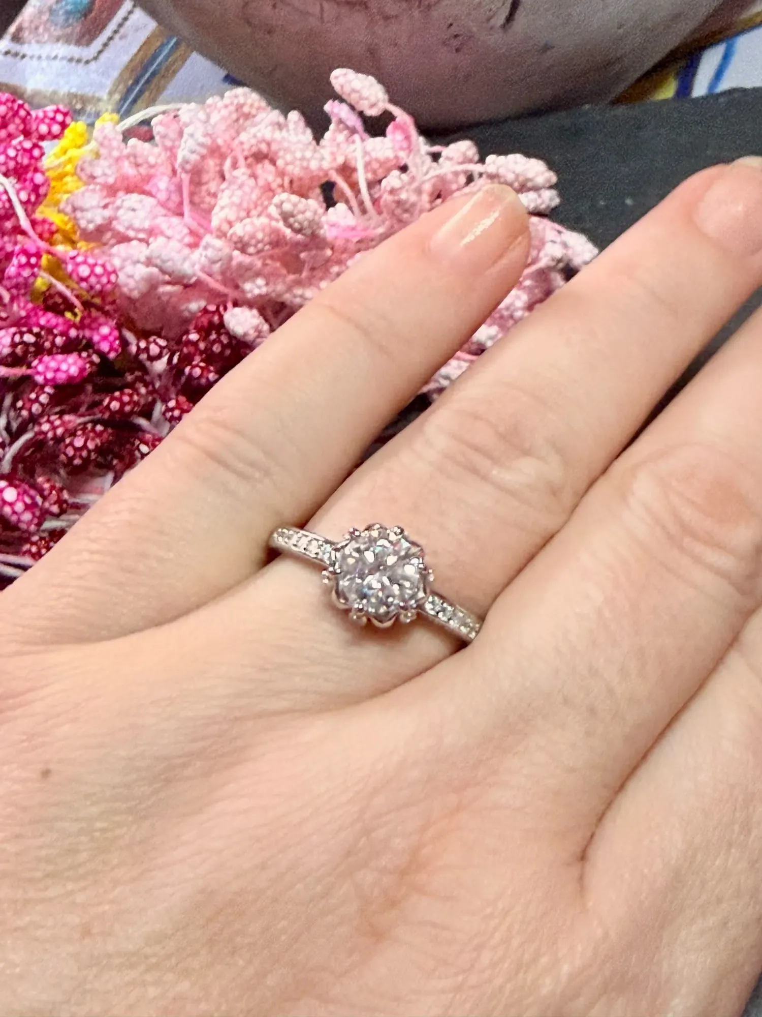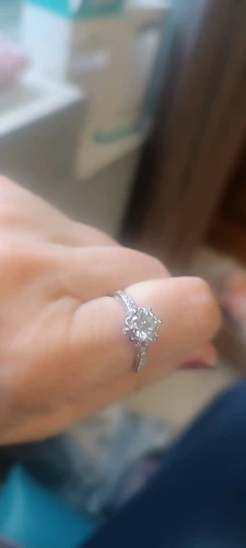 This exquisite floral-inspired ring is a celebration of romance, beauty, and timeless craftsmanship. At its heart lies a brilliant round-cut moissanite, carefully set within a delicate flower-shaped crown that enhances its sparkle from every angle. The softly sculpted petals embrace the center stone, creating a graceful and feminine silhouette that feels both classic and modern.