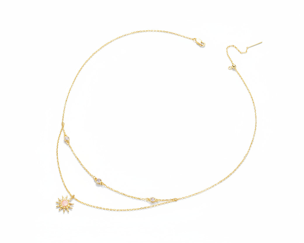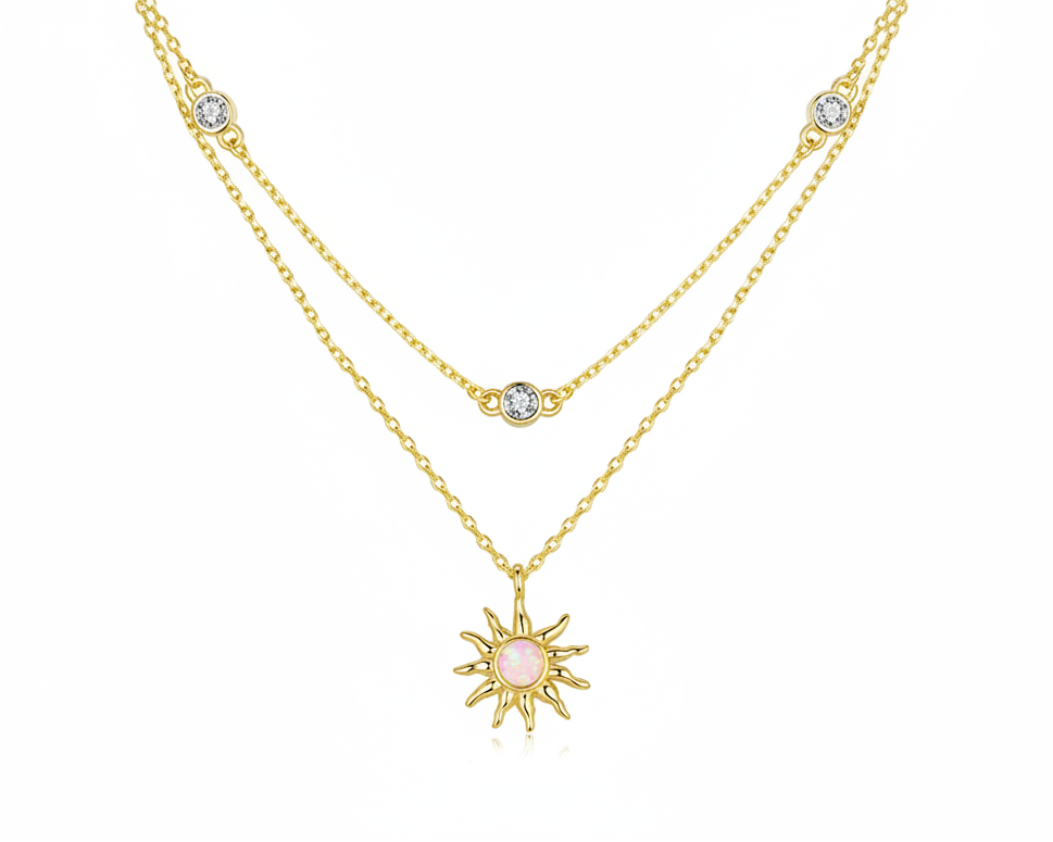 The Gold Sun Necklace is a radiant symbol of light, warmth, and inner strength. This elegant layered design features two delicate gold-tone chains accented with subtle bezel-set stones and finished with a luminous opal-style sun pendant at the center.