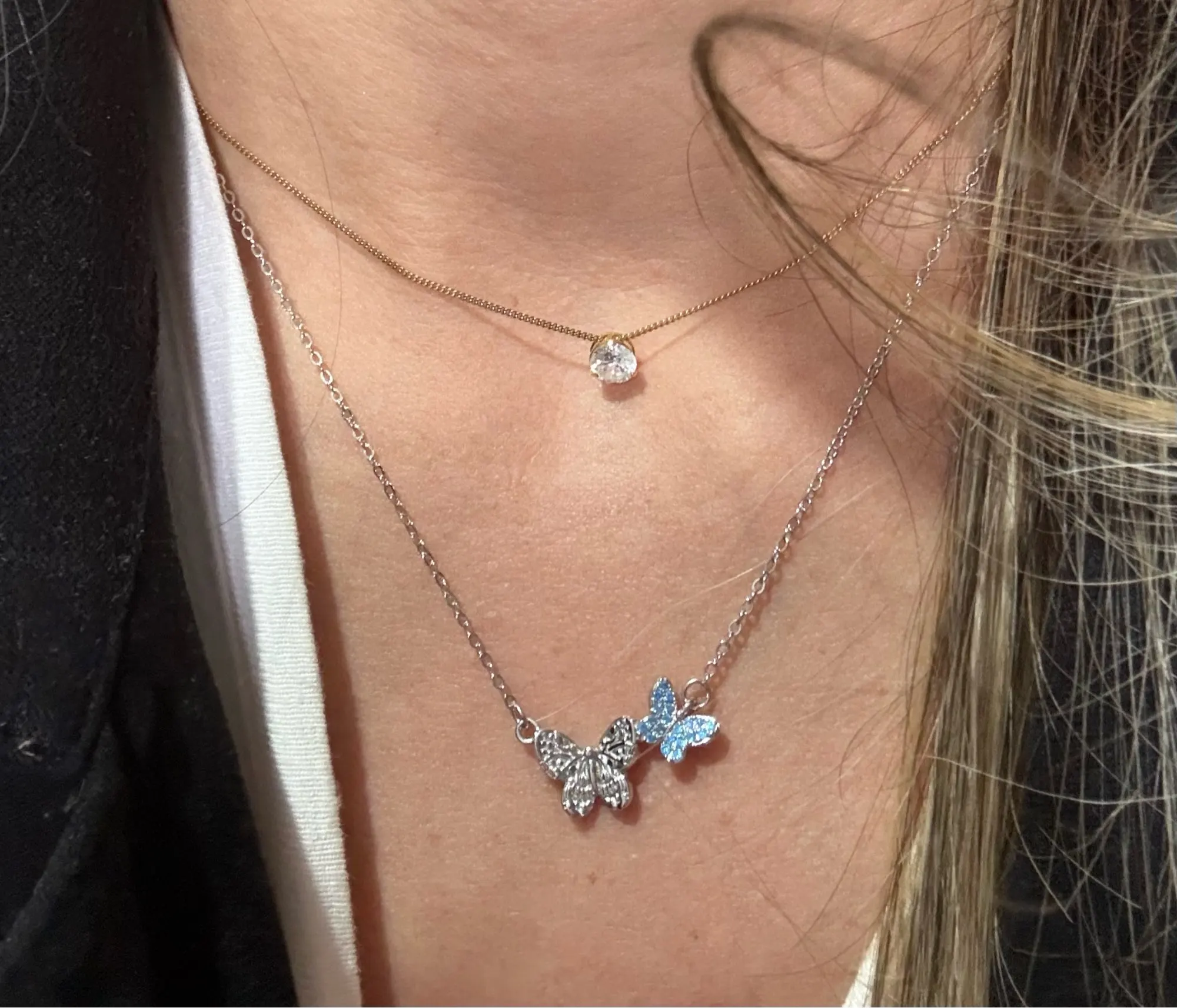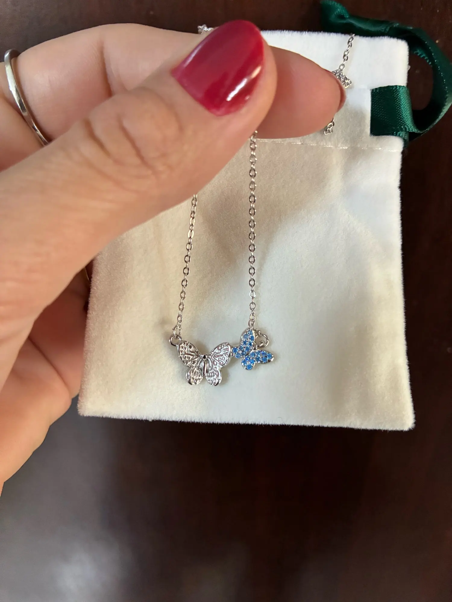 The Harmony Butterfly Necklace is a delicate symbol of freedom, transformation, and inner beauty. Featuring two butterflies - one in polished sterling silver and the other adorned with sparkling blue stones - this design represents the perfect balance between elegance and expression.