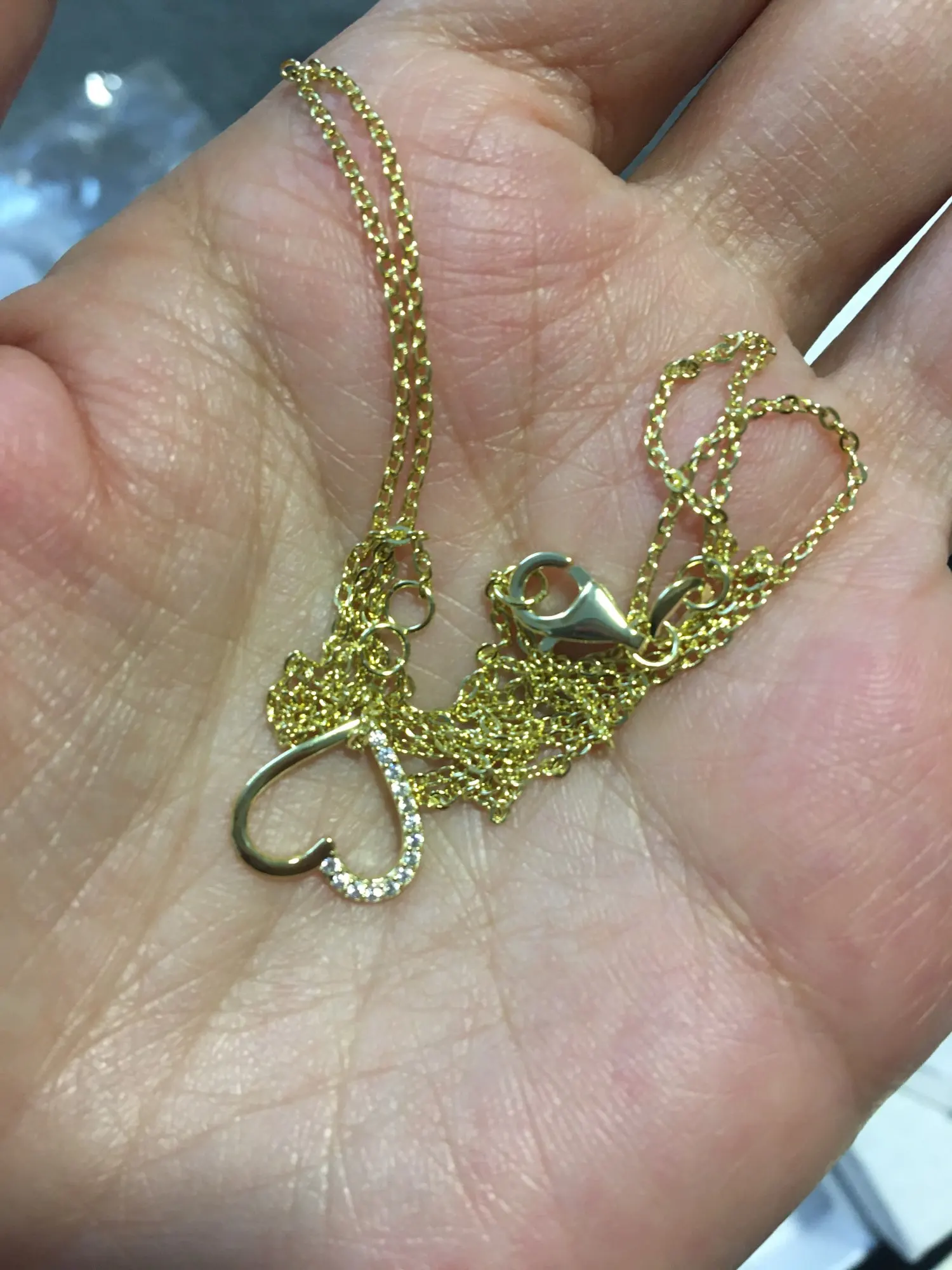 Pendant was as expected for price point, so i'm not complaining. Just adding the rest here for potential buyers of this type of pendant. The heart is very thin, and that means it doesn't have enough weight to sit well, being a floating open heart. So it turns over constantly and goes upside down etc i have the exact same necklace with the double intertwined hearts, and it's even worse, the side not showing the cz's is usually how it sits on the chest. . . . As the cz's mean that is the heaviest part and the heaviest part of anything is going to want to go beneath, or under. . .